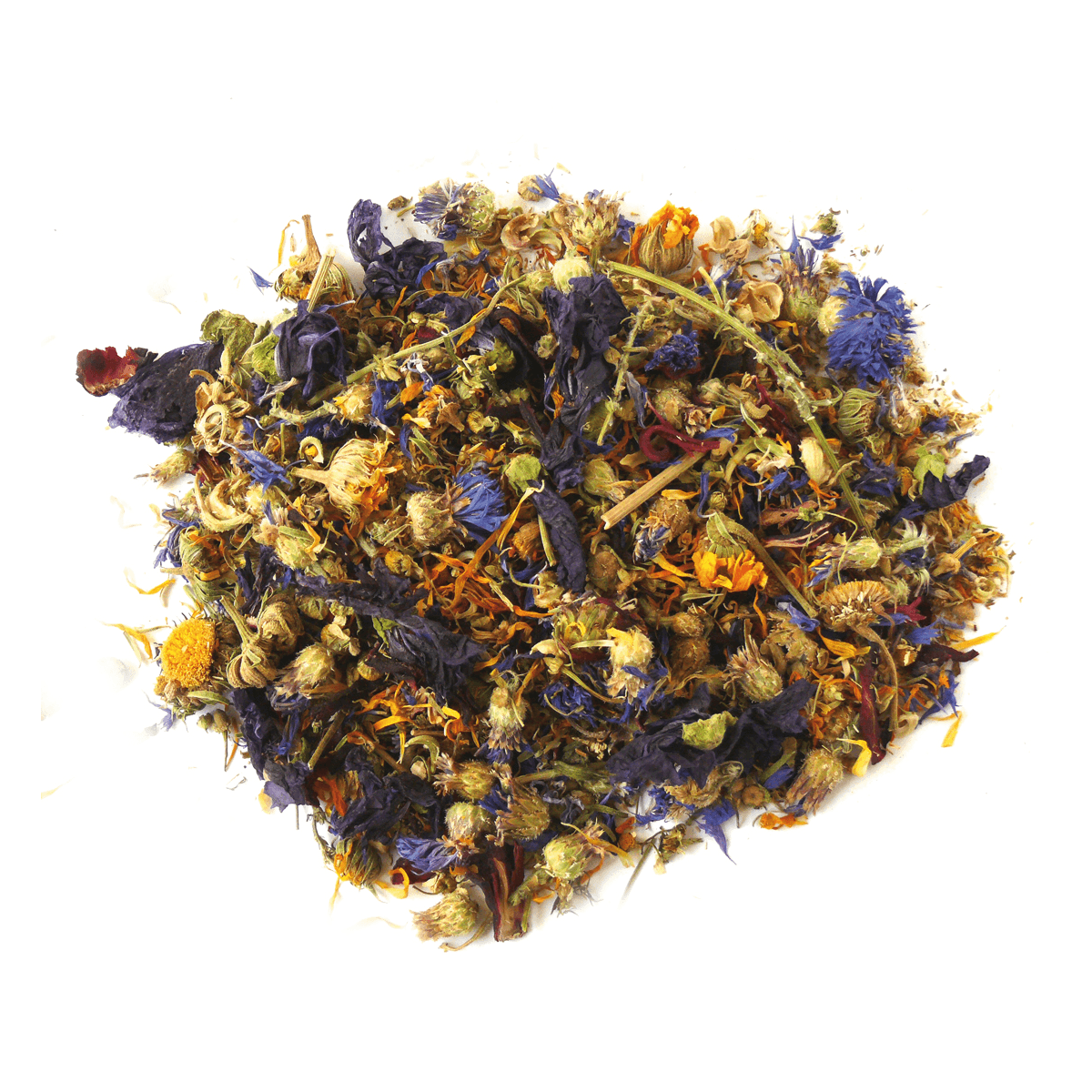 - 🌱 Zusammensetzung: Ringelblumenblüten, Hibiskusblüten, Rotkleeblüten, Sandstrohblumen, Kamilleblüten, Kornblumenblüten, Rosenblütenblätter, Sonnenblumenblätter und Jasminblüten