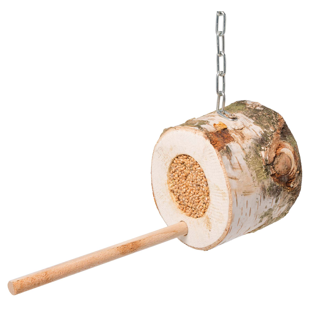 Die runde Schaukel besteht aus Birkenholz und ist in der Mitte mit Hirse befüllt – ideal, damit Vögel gleichzeitig sitzen und knabbern können. Sie verbindet Sitzgelegenheit und Futterquelle in einem Produkt.